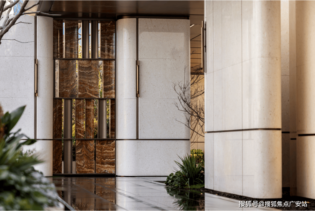 正在基座设想上,利用大面积石材共同艺术玻璃及古铜色金属窗框,辅以奢石和艺术元素进行点缀,以此打制极致的归家体验。